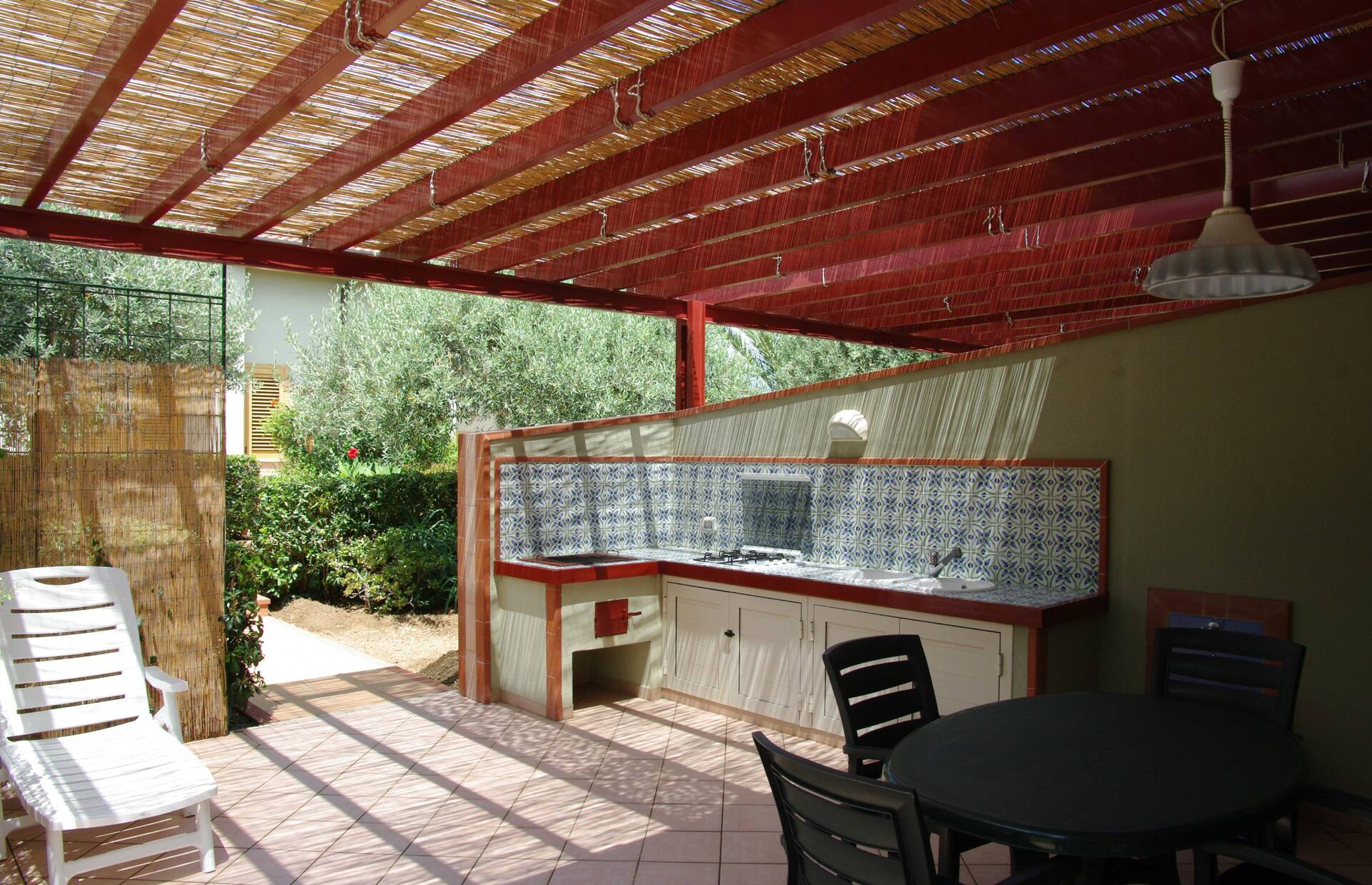 Kaksikerroksisen huoneiston alakerrassa on keittiö, olohuone ja kylpyhuone, yläkerrassa kylpyhuone sekä kaksi makuuhuonetta, joista toisessa pn parivuode, toisessa erilliset vuoteet. Kylpyhuoneissa on suihku ja wc. Yläkertaan vievät portaat ovat kapeat. Terassilla on ulkokeittiö ja grilli sekä ulkosuihku. Alakerran sohvasta saa lisävuoteen viidennelle.