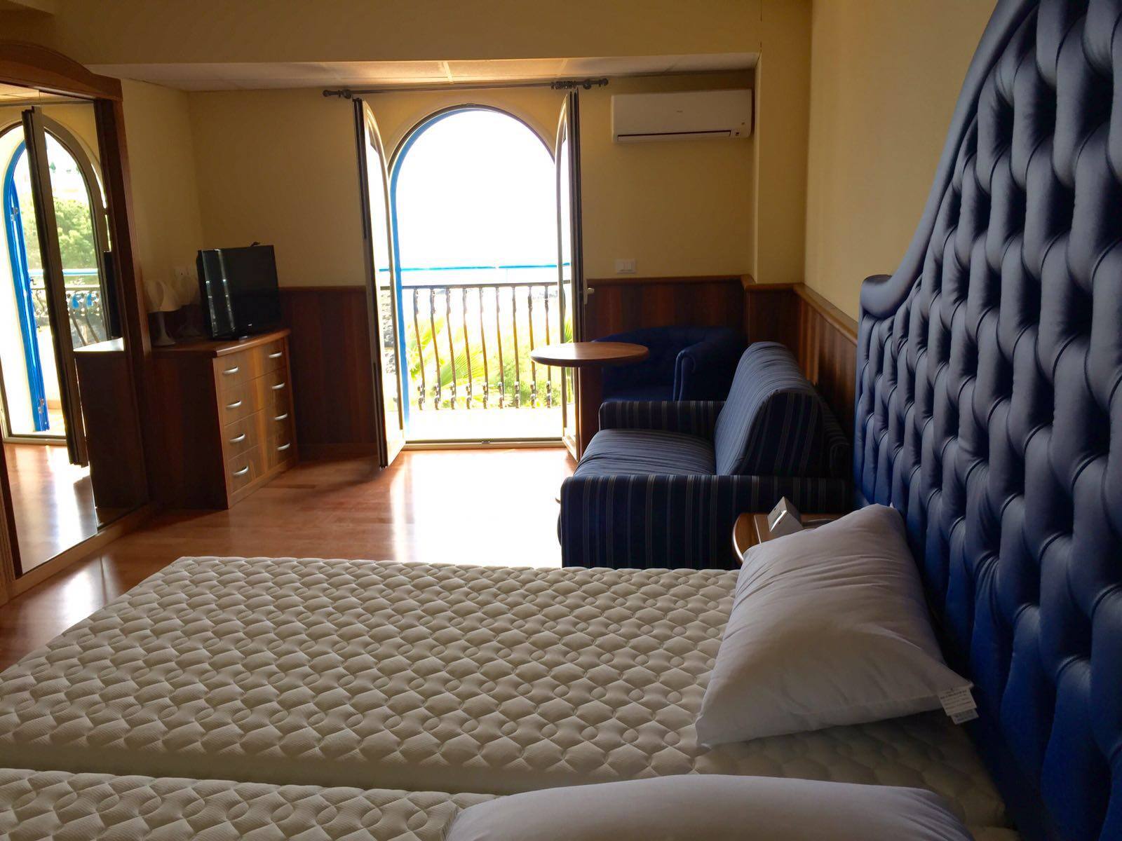 Kahden hengen huoneessa on suihku, wc, parveke ja merinäköala. Osaan huoneista saa lisävuoteen kolmannelle.