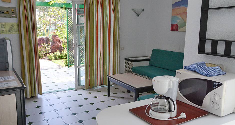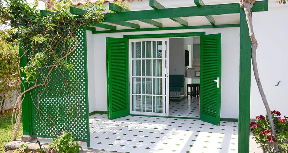Bungalowissa on olohuone, kaksi makuuhuonetta, baarikeittiö, suihkukaappi, wc ja terassi.