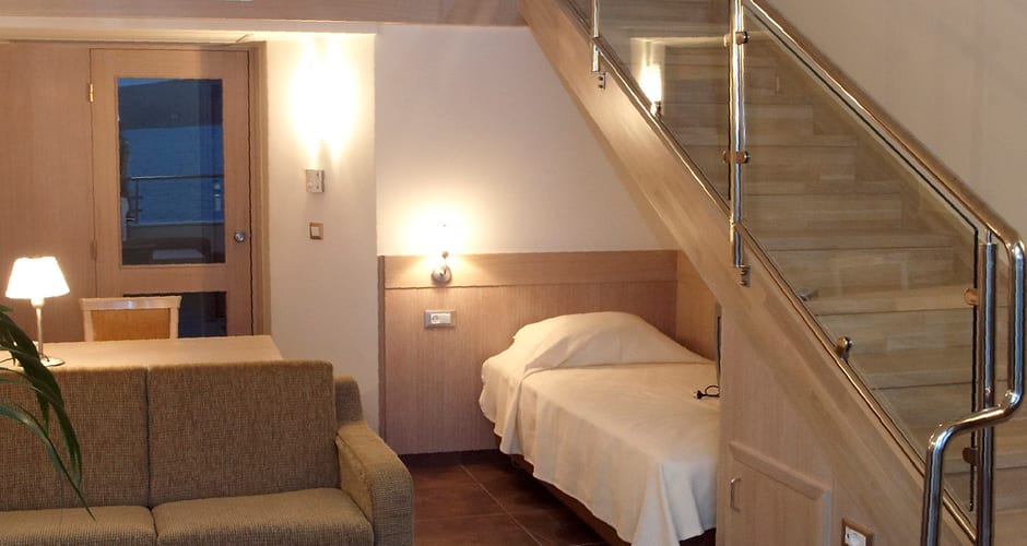 Sviitissä on liukuovella erotettavat oleskelu- ja makuutila sekä parveke tai terassi ja osittainen merinäköala. Makuutilan yhteydessä on poreamme sekä kylpyhuone, jossa on suihku ja wc. Lisävuodemahdollisuus kolmannelle.