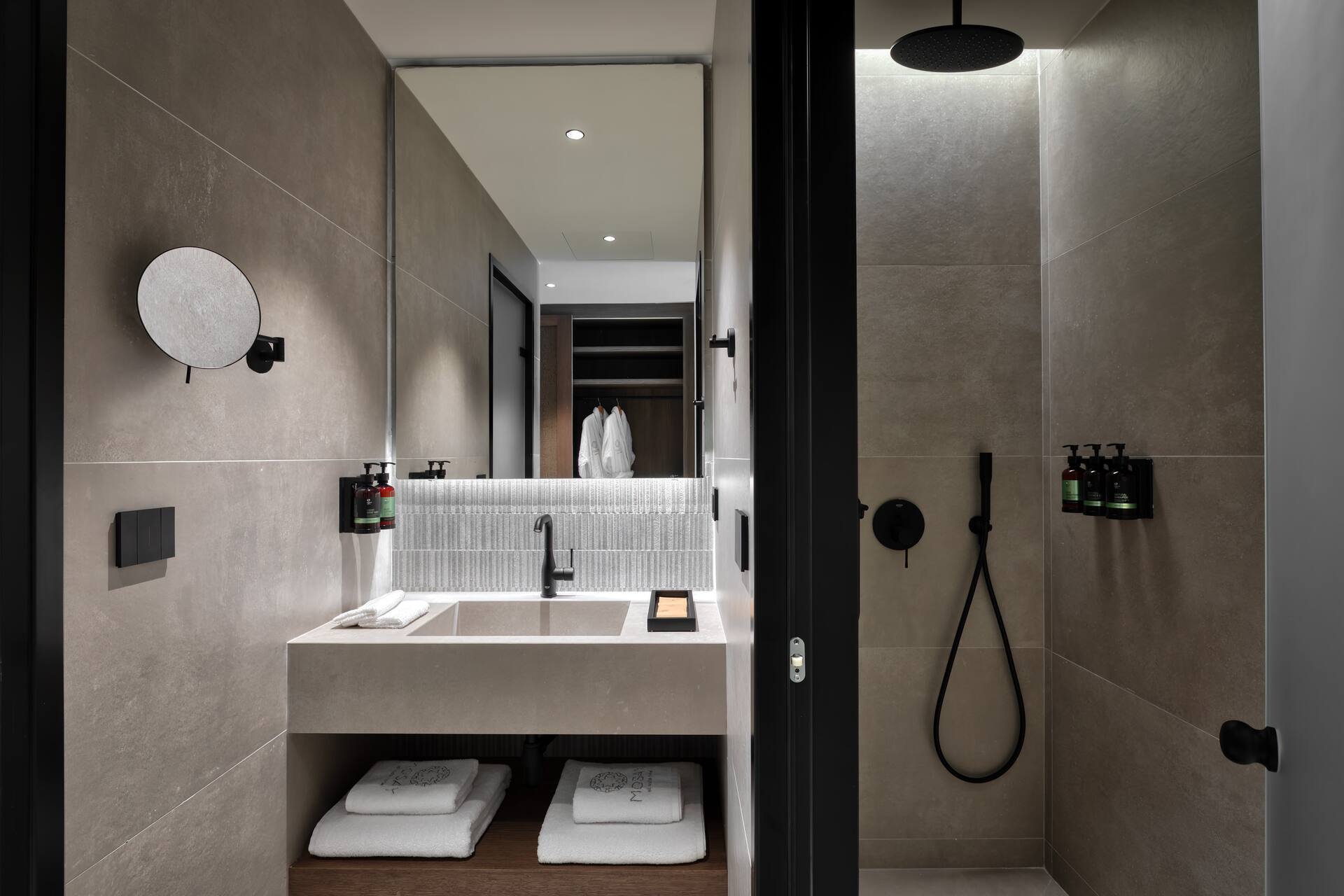 Toisessa kerroksessa olevassa sviitissä on suihku, wc ja parveke, jolla on oma uima-allas.