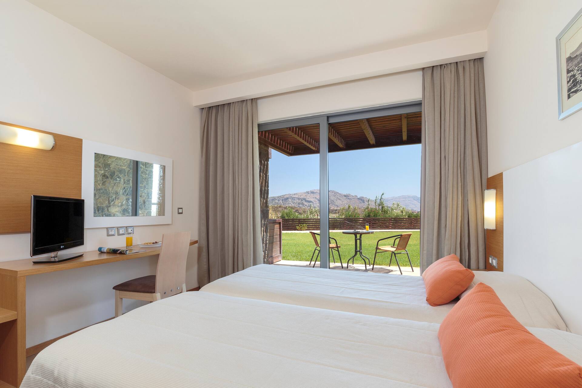 Huoneessa on suihku tai kylpyamme, wc, terassi ja allasnäköala. Lisävuoteen saa kolmannelle. Huoneet on uusittu 2019–2020.