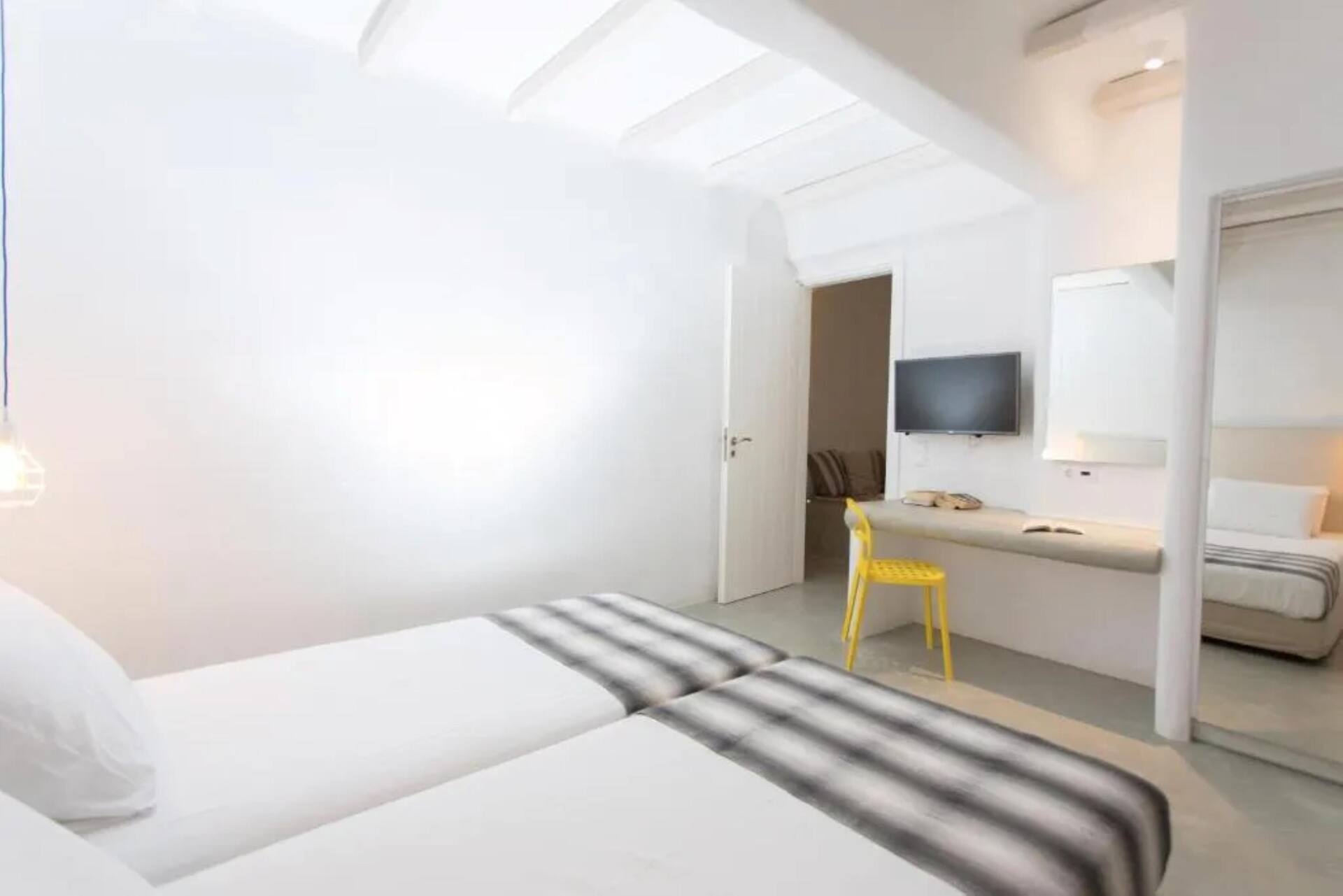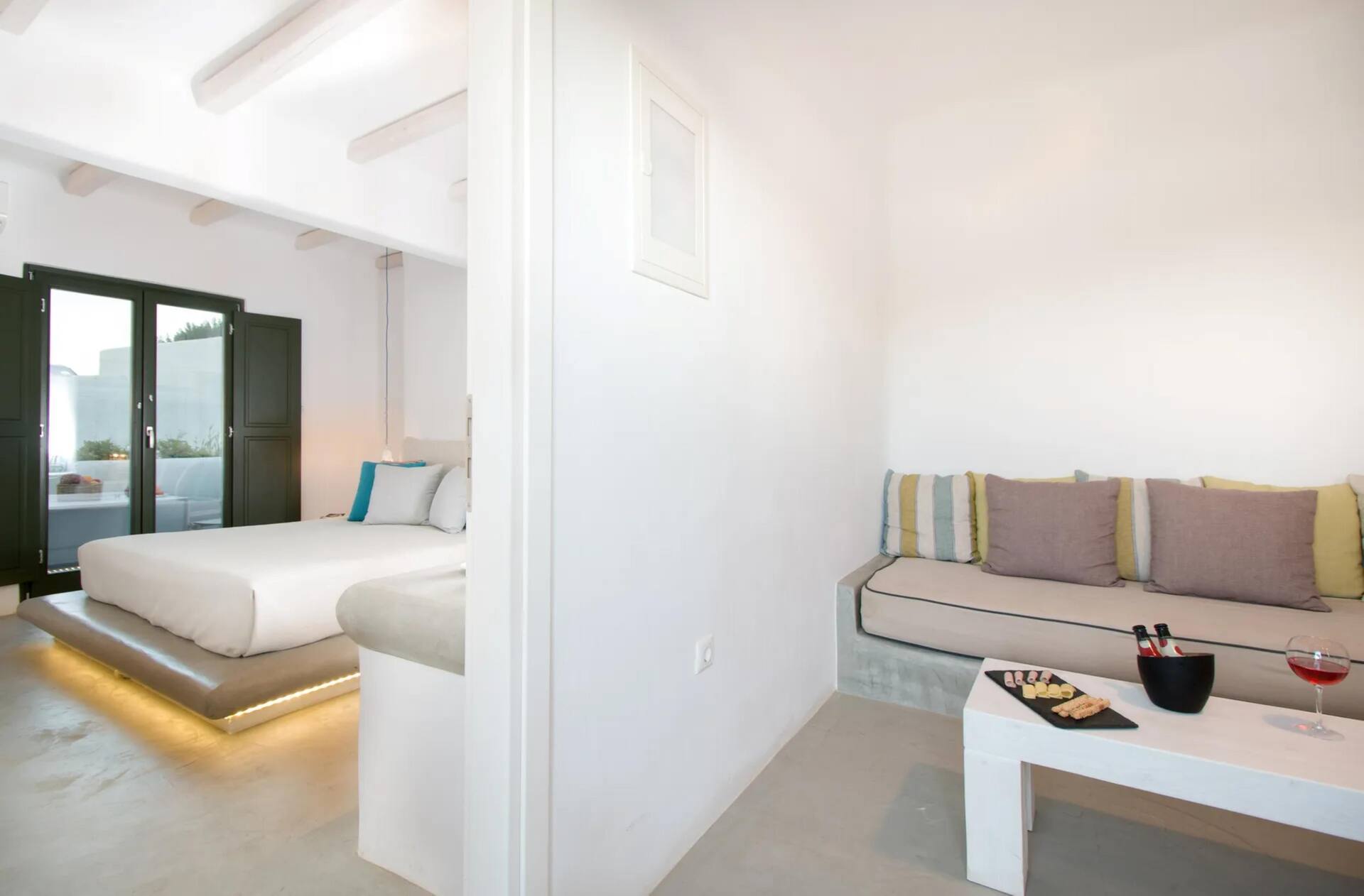 Rauhoittavan valkoiset, vaaleanharmaat ja beiget sävyt sävyttävät tiloja läpi koko hotellin santorinilaiseen tyyliin. Tässä hyvän palvelun hotellissa lomaillaan tyylikkäästi niin pariskuntien kuin ystäväseurueidenkin kesken!
