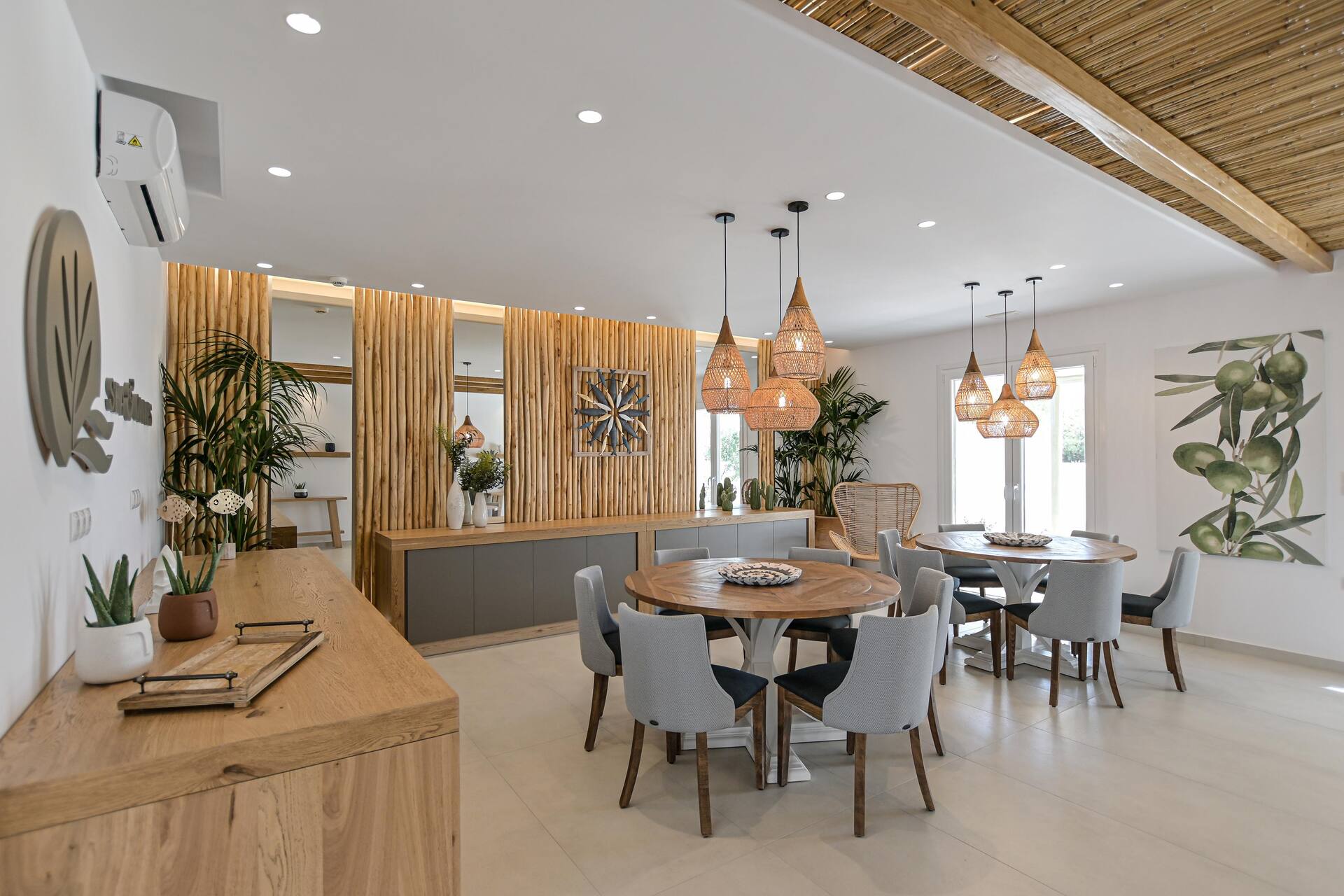 Hotellin kompakti allasalue vastaanoton edustalla kutsuu leppoisaan rentoutumiseen. Aamiainen tarjoillaan rauhallisessa ja valoisassa aamiaishuoneessa, jossa päivä alkaa lempeästi kreikkalaisten makujen siivittämänä. Hotellissa ei ole ravintolaa tai baaria, mutta juuri tämä tekee kokemuksesta ainutlaatuisen – kaikki on suunniteltu täydelliseen vetäytymiseen. Autonvuokraajille hotelli tarjoaa ilmaisen pysäköintimahdollisuuden, joten saaren tutkiminen omatoimisesti on vaivatonta.