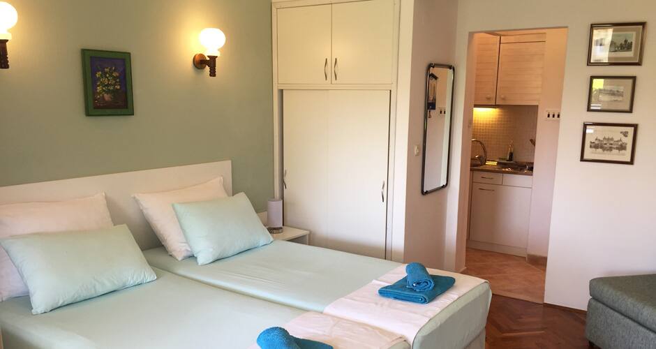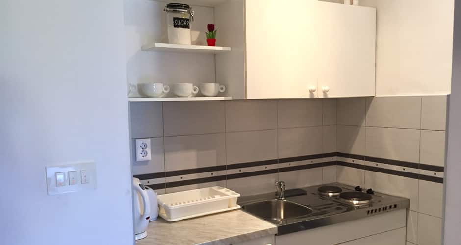 Yksiössä on keittonurkkaus, suihku ja wc sekä yhteinen terassi naapureiden kanssa.