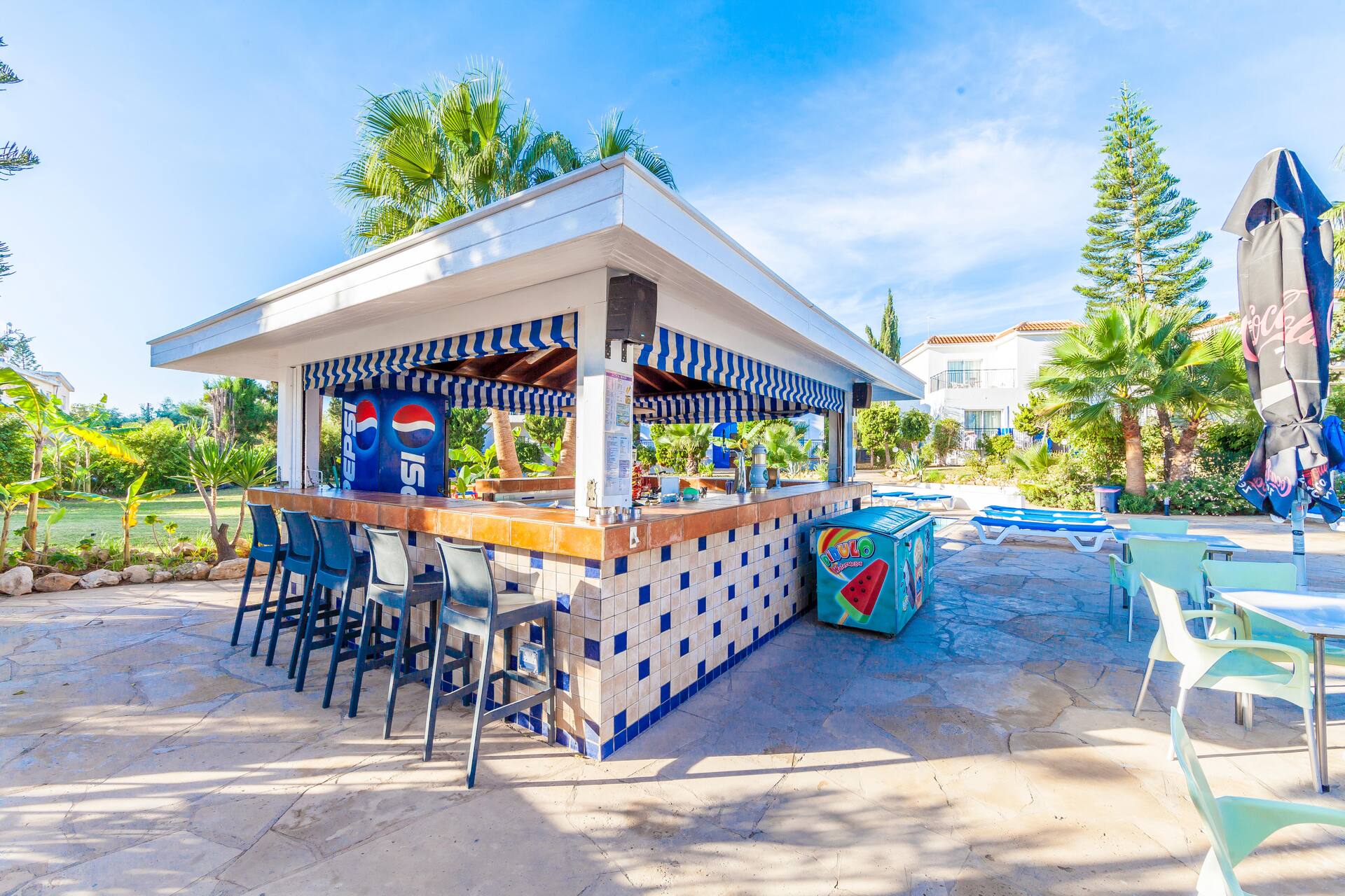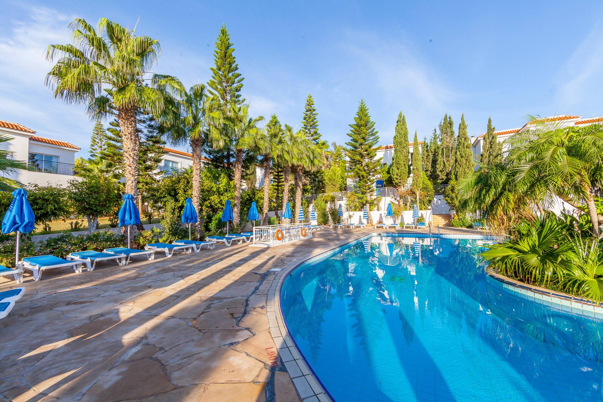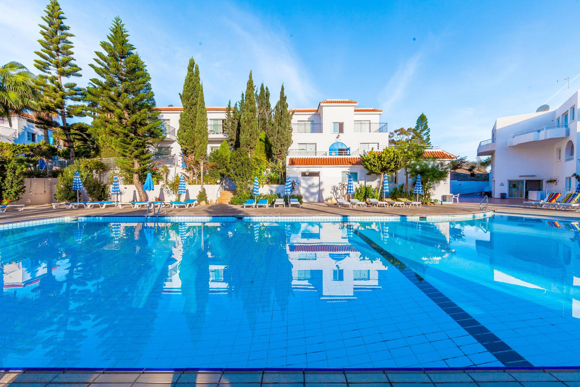 Kreikkalaistyyliin sinivalkoisin sävyin sisustetussa hotellissa on huoneistoja useammassa rakennuksessa, kaunis allasalue uima-altaineen, lastenaltainen ja allasbaareineen, tilaa auringonotolle sekä maukkaita annoksia tarjoileva ravintola. Ravintola on aivan allasalueen kupeessa, joten virvokkeiden ohella purtavaa on helposti saatavilla auringonoton ohessa.