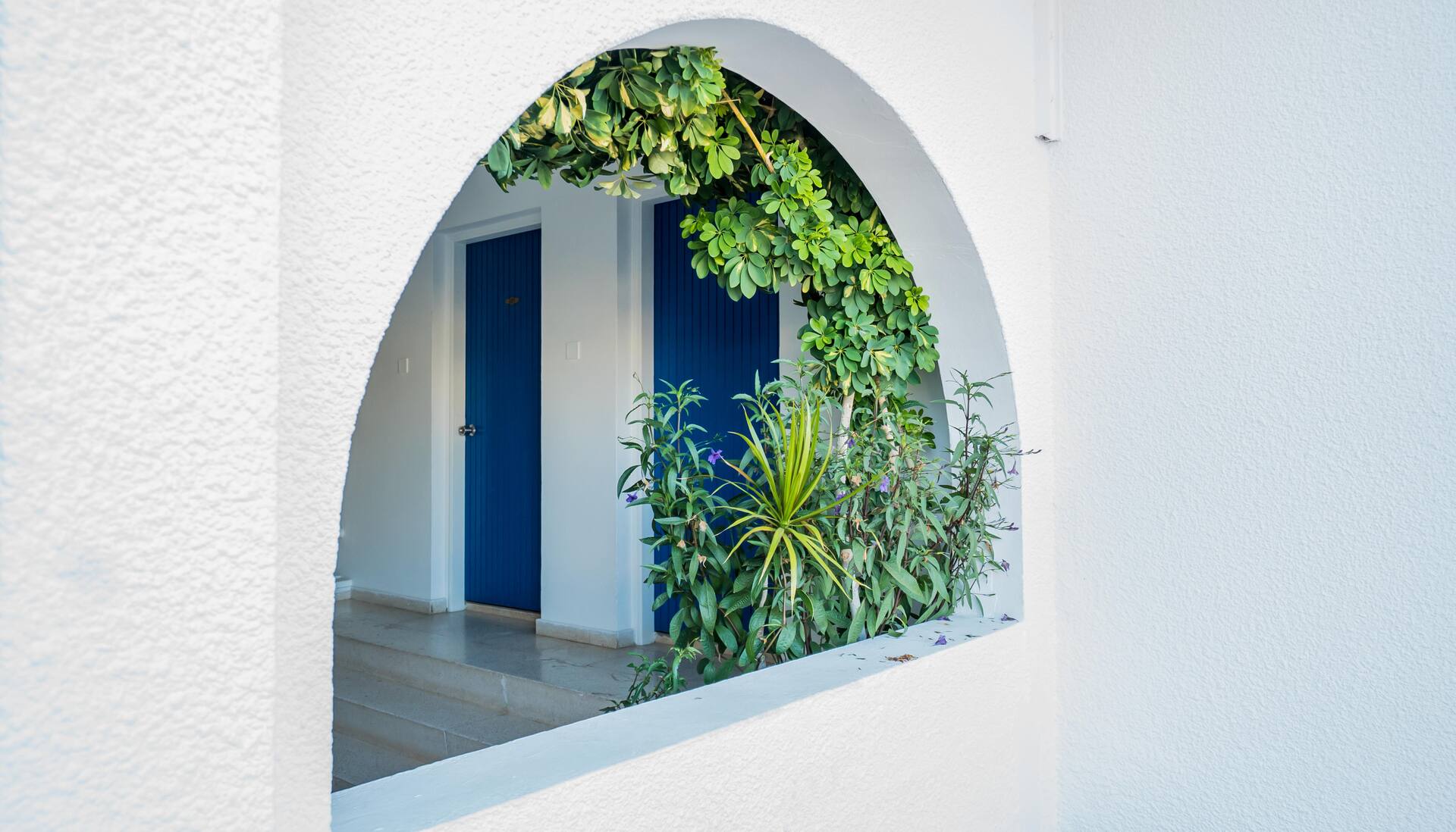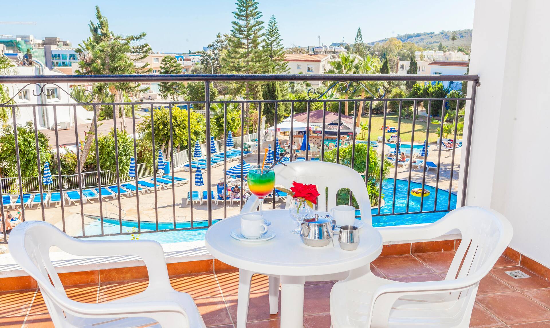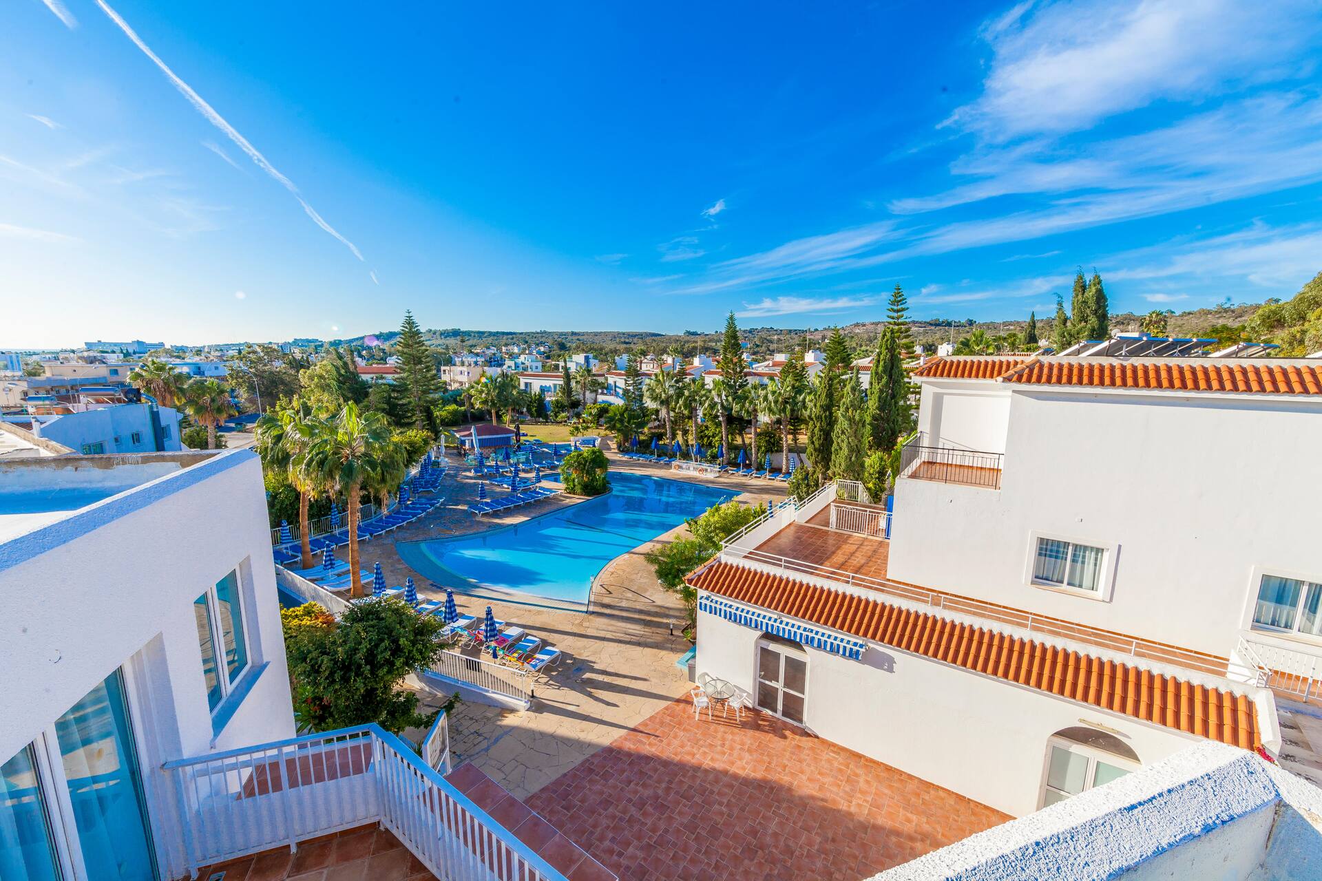 Kreikkalaistyyliin sinivalkoisin sävyin sisustetussa hotellissa on huoneistoja useammassa rakennuksessa, kaunis allasalue uima-altaineen, lastenaltainen ja allasbaareineen, tilaa auringonotolle sekä maukkaita annoksia tarjoileva ravintola. Ravintola on aivan allasalueen kupeessa, joten virvokkeiden ohella purtavaa on helposti saatavilla auringonoton ohessa.