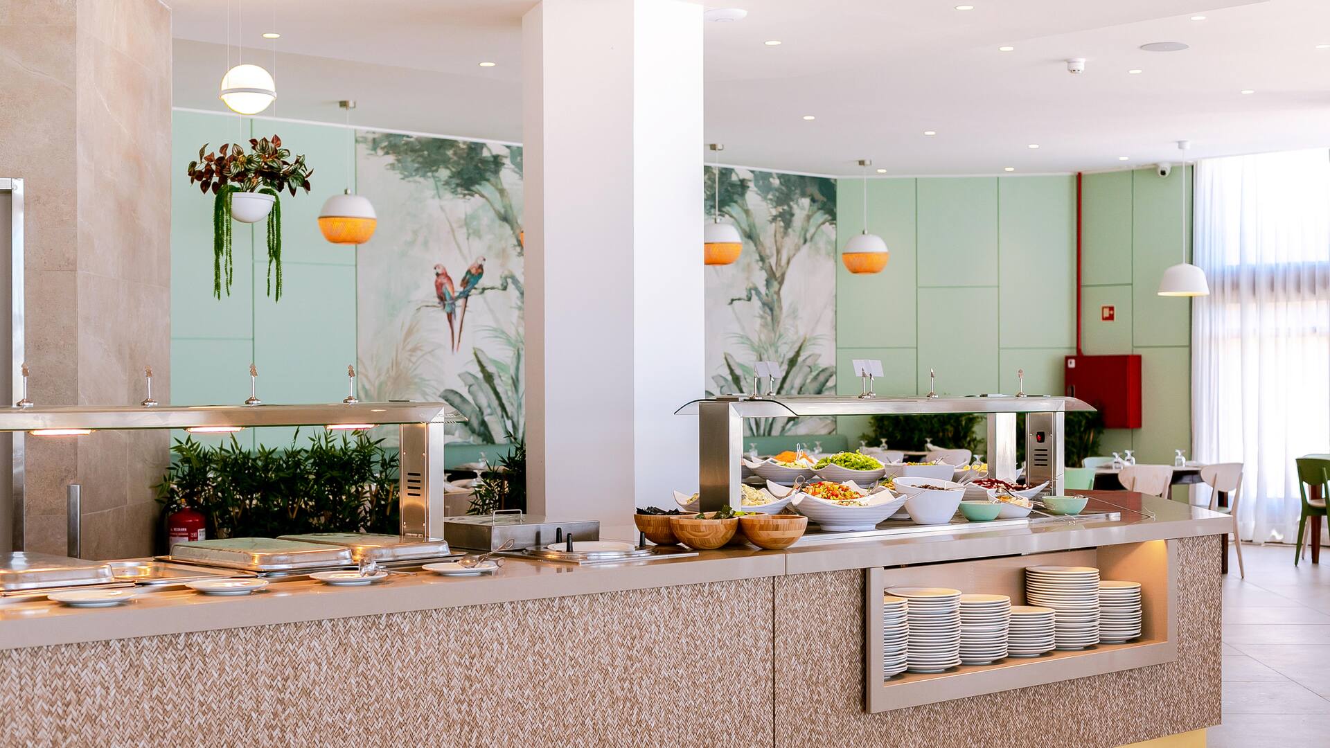 Hotellin ravintolassa tarjoillaan buffetaamiainen sekä lisämaksulliseen puolihoitoon sisältyvä illallinen. Päivän aikana voit tilata à la carte -listalta kevyitä välipaloja, kuten salaatteja ja leipiä. Ravintolan yhteydessä toimii myös baari, jossa voit istuskella iltaisin drinkkiä siemaillen. Hotellin pieni minimarket palvelee arjen tarpeissa, ja vain muutaman sadan metrin säteellä hotellista on useita ravintoloita ja kauppoja.