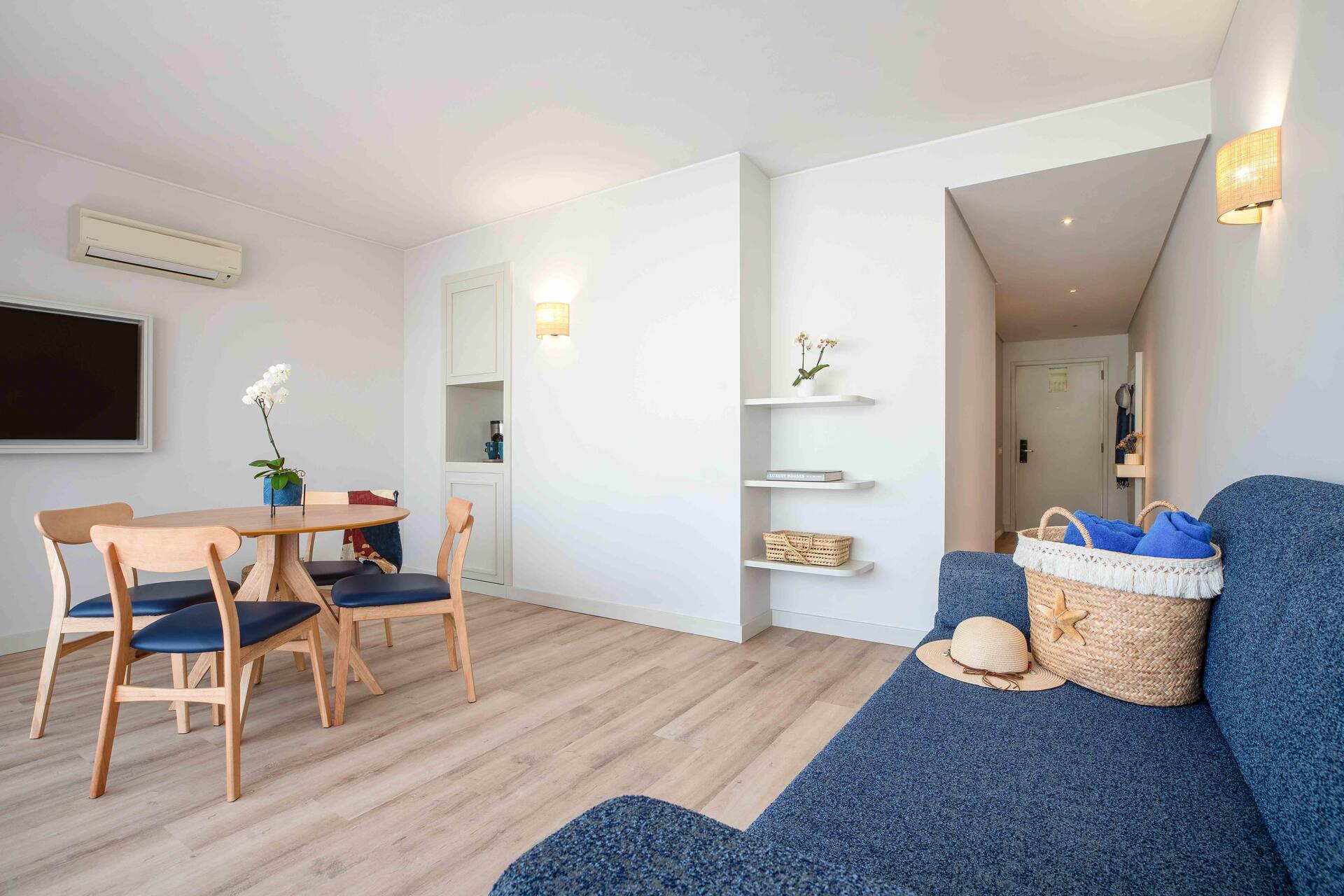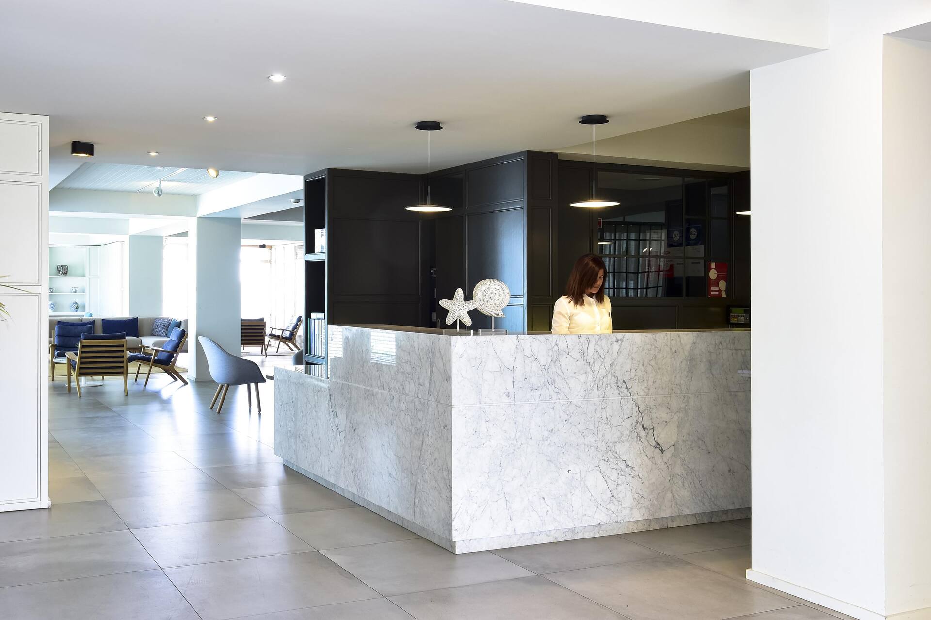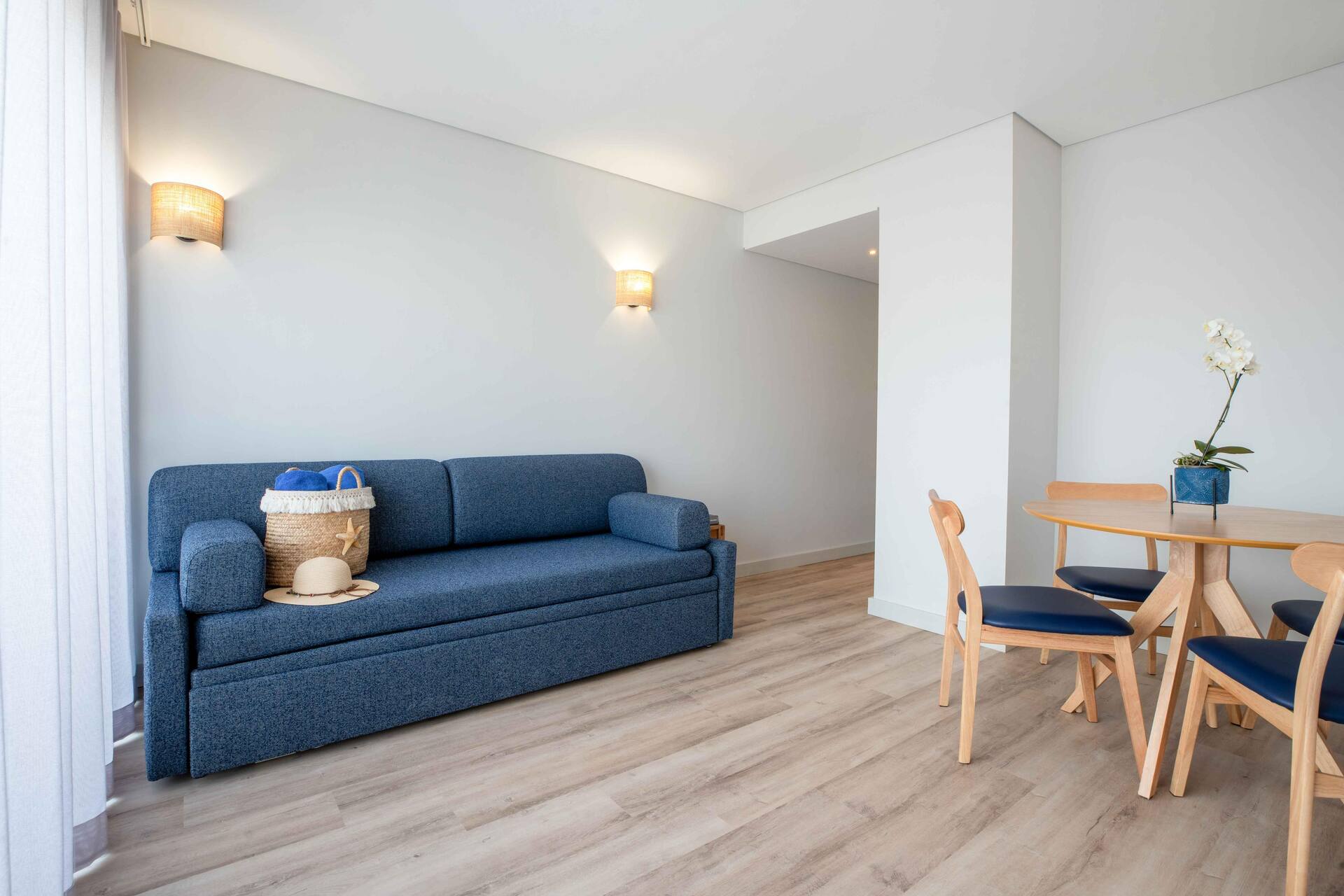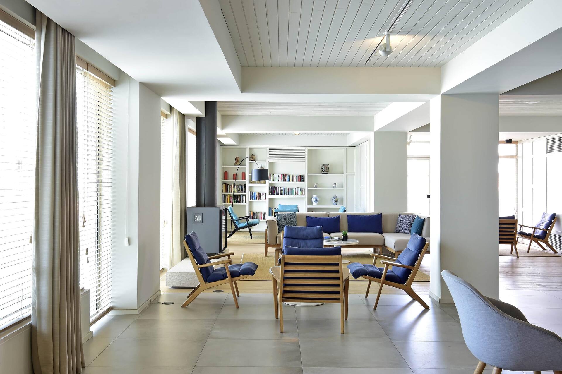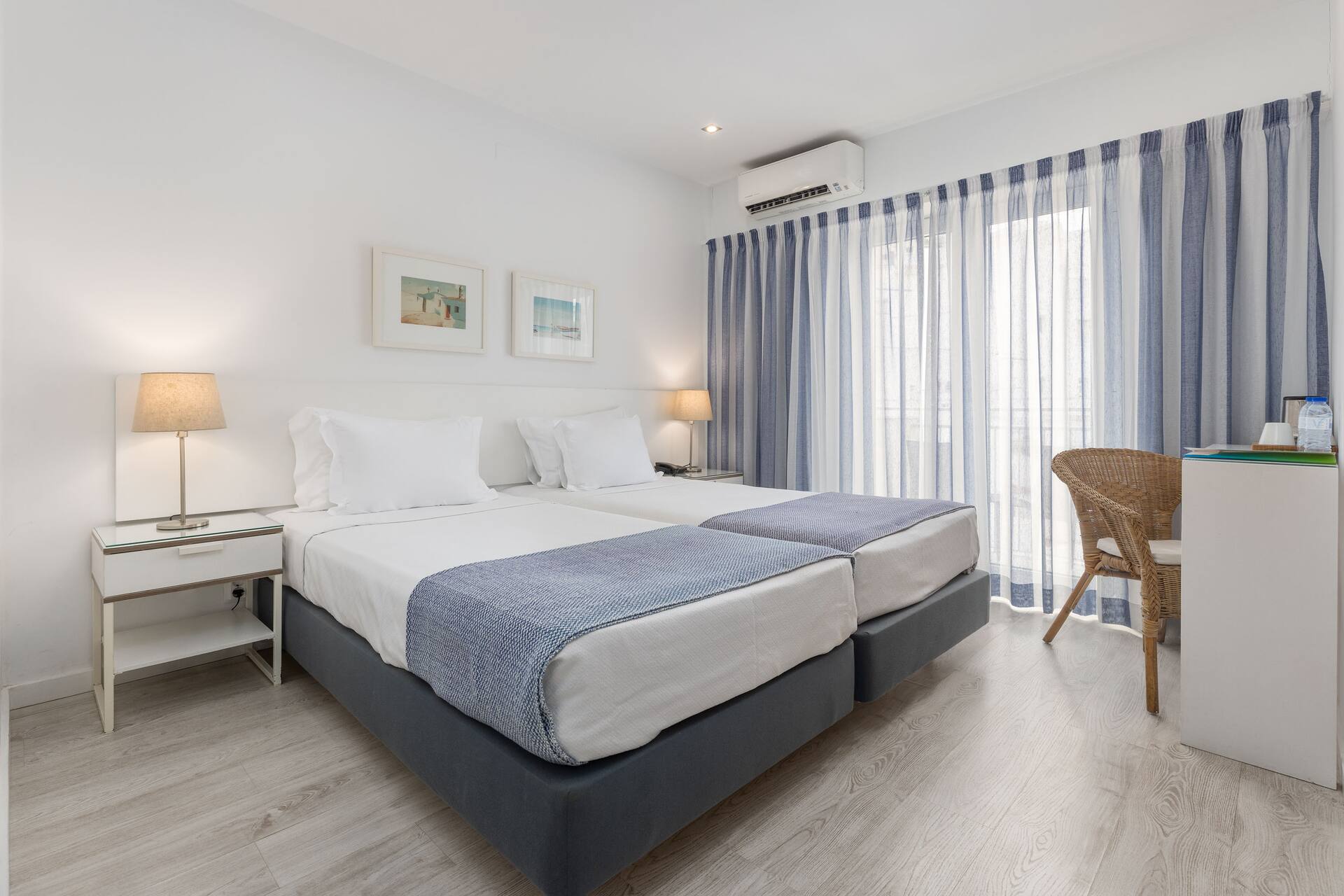 Huoneiden sisustus on saanut inspiraationsa merellisistä maisemista – sinisen ja valkoisen sävyt sekä harmaat puulattiat luovat pelkistetyn tyylikkään tunnelman. Huoneissa on myös äänieristetyt ikkunat suojaamassa untasi keskustan pitkään jatkuvalta yöelämältä, ellet sitten itse ole menossa mukana.