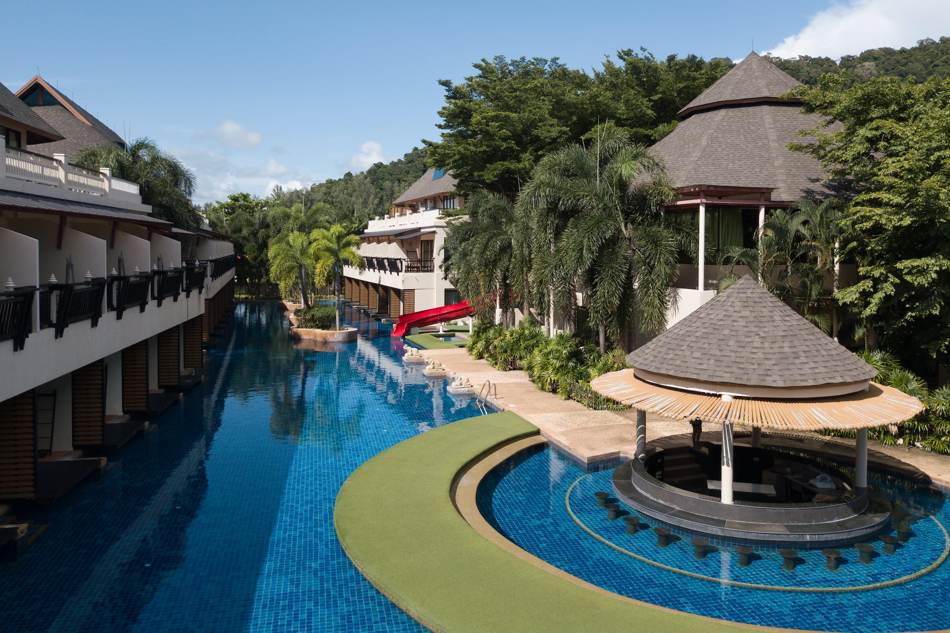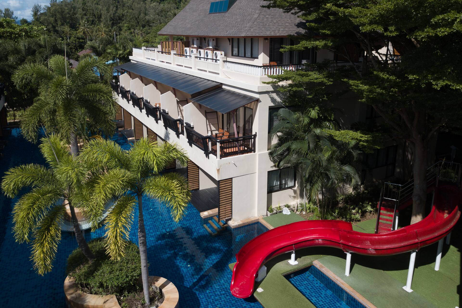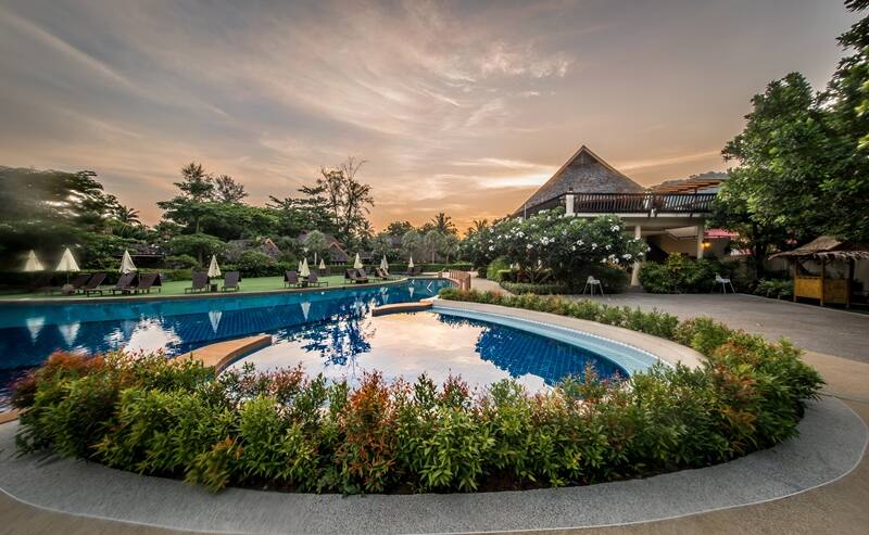 Vehreä hotellialue rannalla