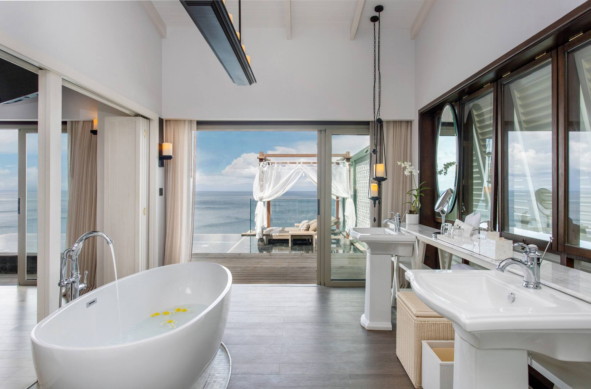 Kahden hengen Seaview Pool Villa Romancessa on makuuhuone, jossa parivuode. Kylpyhuoneessa on suihku, kylpyamme ja wc. Tilavalla aurinkoterassilla on oma uima-allas (n. 3,6 x 6,8 m) ja aurinkopedit.